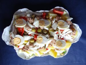 Plato sencillo, completo y familiar, de origen campestre, donde se disfrutaba y se reponían fuerzas durante las labores de la campiña, elaborado con productos de la huerta, acompañados con huevo duro y atún en conserva.….