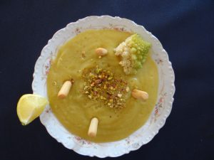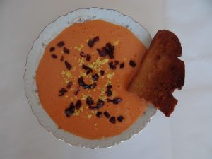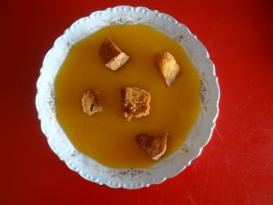 Puré espectacular de patatas y hortalizas, acompañado con picatostes de pan, riquísimo…..