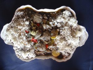 Variante de otras preparaciones similares que se ofrecen en las Islas Baleares, plato marinero guisado por los pescadores a bordo de sus barcos para contener el frío intenso durante la faena de pesca o en las tabernas de sus puertos para calentarse después de la travesía…..