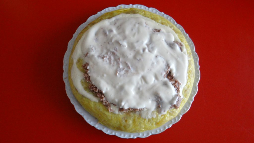 Probé esta tortilla de patatas en Santander y yo que soy muy tortillero me quede maravillado, no lleva cebolla, cuajada y jugosa a la vez, cubierta con mahonesa y atún y con «txapela» …..