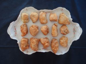 Se pone en el fuego una sartén con 1 dl. de aceite de oliva (suave) y cuando comience a calentarse, a fuego medio-fuerte, se añaden los tacos de bonito (previamente se les echa 0,5 g. de sal fina por ambos lados, se rebozan uno por uno en 150 g. de harina de pescado, se sacuden para que suelten el exceso de harina y se rebozan en 3 huevos batidos) y se fríen de cuatro en cuatro durante dos minutos, se les da la vuelta y se fríen otros 2 minutos, se retiran con la ayuda de una espumadera y se ponen en una bandeja con papel absorbente.