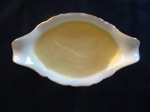 En un vaso de batidora se cascan 3 huevos y se añaden 0,2 gr. de sal maldom, 0,2 gr. de azúcar moreno, 0,2 gr. de pimienta blanca molida, 0,2 gr. de pimienta negra molida, 0,5 gr. de eneldo seco y ½ diente de ajo pelado y se comienza a batir a baja potencia sin mover el vaso, se incorpora a chorro fino 1 dl. de aceite de oliva (suave) y cuando comience a emulsionarse la salsa se añade el zumo de 1 limón, 30 gr. de mostaza y 15 gr. de mostaza de Djon y se bate a baja potencia hasta conseguir el espesor deseado. Se tapa con papel film y se conserva durante 20 minutos en el frigorífico.