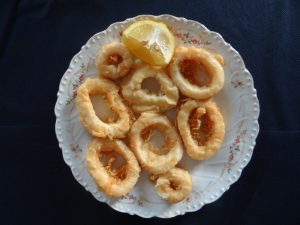 Se pone en el fuego una sartén con 1 dl. de aceite de oliva (suave) y cuando comience a calentarse, a fuego medio-fuerte, se añaden los calamares (previamente se les echa 0,5 g. de sal fina por ambos lados, se rebozan uno a uno en 150 g. de harina de pescado, se sacuden para que suelten el exceso de harina y se rebozan empapándolos en la pasta para freir Orly) y se fríen de cuatro en cuatro durante 2 minutos, se les da la vuelta para que se hagan por ambos lados y se frien durante 2 minutos, se retiran con la ayuda de una espumadera dejando que escurra el exceso de aceite de los calamares y se colocan en un plato con papel absorbente.