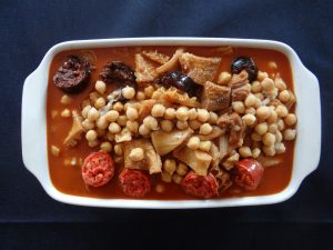 - Se lavan bajo el grifo con agua fría 3 kg. de callos de ternera, 1 ½ kg. de morro de ternera, ½ pata de ternera, 4 chorizos, 3 morcillas y 1 hueso de jamón.