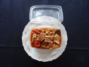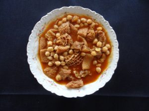 - Se ponen en remojo en agua fría 250 g. de garbanzos con 0.5 g. de sal gorda durante doce horas, transcurrido el tiempo se les quita el agua y se refrescan poniéndolos bajo el grifo con agua fría.