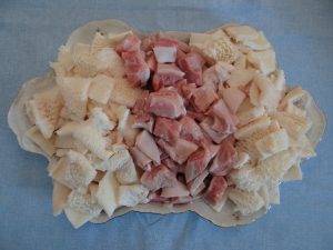 Se blanquean 3 kg. de callos de ternera, 1 ½ kg. de morro de ternera y ½ pata de ternera. Se ponen en una olla con la tapa abierta con agua fría y cuando comience a hervir se retira el agua y posteriormente se refrescan poniéndolos bajo el grifo con agua fría.