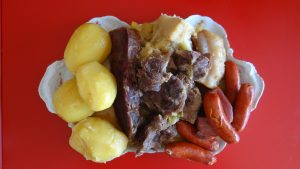 - Se lavan bajo el grifo con agua fría todas las carnes, 450 g. de carne de morcillo de ternera, 200 g. de cecina, 5 chorizos frescos, 200 g. de tocino magro, 1 hueso de rodilla de ternera y 200 g. de punta de jamón serrano curado.