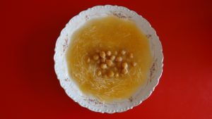 Se pone en una cacerola el caldo del cocido previamente colado y cuando comience a calentarse se añaden 150 g. de fideos de cabello de ángel y se deja cocer a fuego medio durante 20 minutos.
