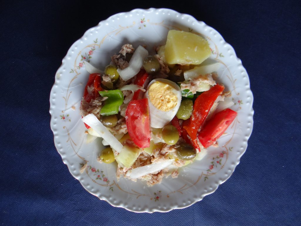 Se colocan en una bandeja previamente cortados en cascos o en cuartos 1 kg. de patatas cocidas y peladas y 6 tomates, 1 cebolla cortada en juliana, 3 pimientos verdes cortados en cuadrados, 2 pepinos pelados y cortados en rodajas y luego en cuartos, 50 g. de aceitunas de manzanilla, 50 g. de aceitunas de picual, 350 g. de atún en conserva, 100 g. de pimiento rojo en conserva cortado en tiras y 3 huevos cocidos cortados por la mitad. A la hora de servir a los comensales se echan 0.5 gr. de sal fina y se incorporan 1 cl. de vinagre blanco y ½ dl. de aceite de oliva virgén extra y se mezclan con los ingredientes.