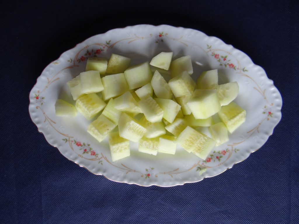 - Se pelan y se cortan en rodajas y luego en cuartos 2 pepinos.