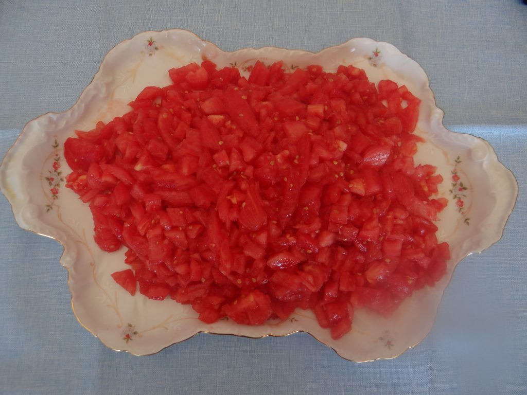 - Se pelan, se les quita las pepitas y se cortan en trozos pequeños y finos 1 kg. de tomates.