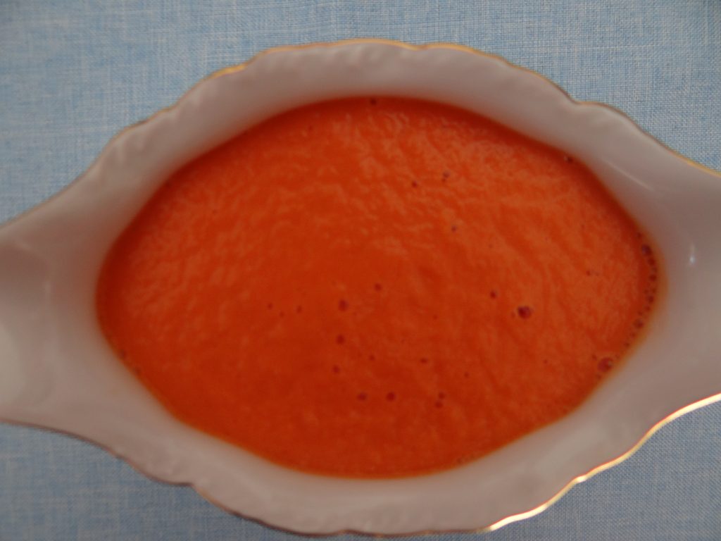 Se pone en el fuego una sartén con 0.2 ml. de aceite de oliva (suave) y cuando comience a calentarse se añaden previamente cortados en trozos pequeños y finos 1 diente de ajo y 1 cebolla y se rehogan a fuego bajo durante 5 minutos, se añaden 1 kg. tomates y se sofrien, se echan 40 g. de azúcar y 0,2 g. de sal fina, se mueve y transcurridos 30 minutos se retira del fuego, se deja enfriar, se tritura y se pasa por un chino.