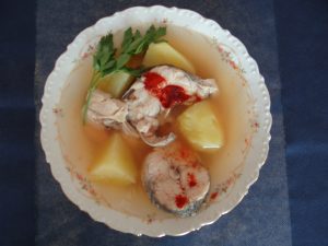 Se pone en el fuego una cacerola con 2 ½ l. de agua fría y 1 cebolla cortada por la mitad y cuando comience a calentarse se añade 1 kg. de patatas cortadas en cascos, una merluza de 2 kg. cortada en rodajas, 1 hoja de laurel y 1 rama de perejil, se incorpora 1 ml. de aceite de oliva (suave), se echan 0.2 g. de pimentón dulce y 0.5 g. de sal gorda y se deja hervir a fuego bajo durante 10 minutos, transcurrido el tiempo se espuma, se incorpora el zumo de 1 limón y se deja hervir durante 10 minutos, hasta conseguir el punto de cocción deseado.