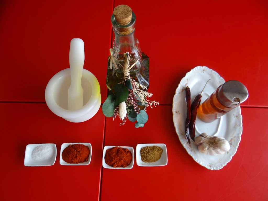 En un mortero se majan los dientes de 1 cabeza de ajo cortados en trozos, se echa 6 g. de sal fina y 4 g. de comino, se añaden 2 guindillas previamente quitadas las semillas y cortadas en láminas finas, se añade 1 rebanada de pan frito troceado y se sigue majando, se echan 20 g. de pimentón dulce y se mezclan todos los ingredientes, se echa 1 dl. de aceite de oliva (suave) y 10 cl. de vinagre de vino blanco y se bate hasta que ligue.