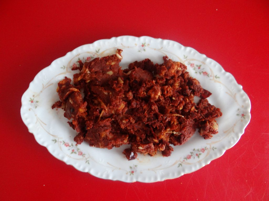 - Se limpian las guindillas, se las quitan las pepitas y se cortan en laminas finas.