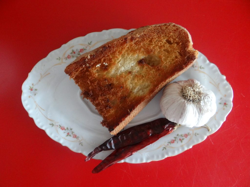 Se pone en el fuego 1 sartén con ½ dl. de aceite de oliva 0,4 (suave) y cuando esté caliente se añade 1 rebanada de pan de hogaza, se le da la vuelta para evitar que se tueste, se saca del fuego con una espumadera procurando que suelte la mayor cantidad posible de aceite y se pone en un plato con papel absorbente, se deja enfriar y se trocea.