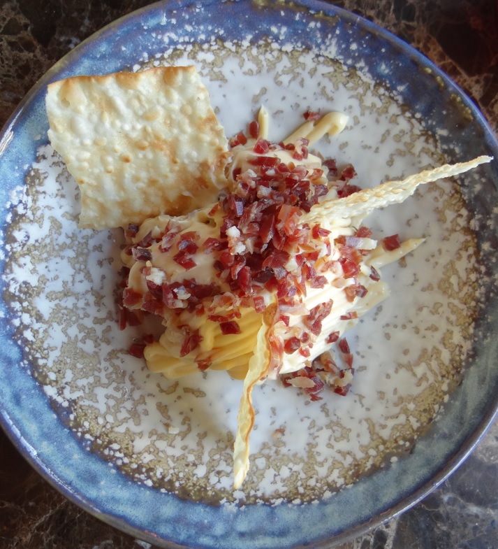 Ensaladilla rusa con jamón ibérico: Buena presentación, sorprende su sabor original, con una textura muy agradable.