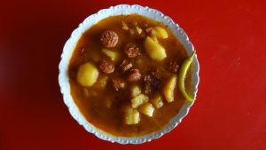 A la hora de partir las patatas en cuartos, se las hace un corte con el cuchillo y antes de terminarlo por completo se hace palanca hacía afuera para que casque la patata, de esta forma cuando cueza, la patata soltará el almidón y el caldo queda más espeso.Se le pide al carnicero que corte las costillas de cerdo en trozos pequeños (para ración).