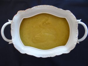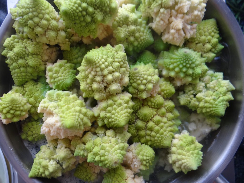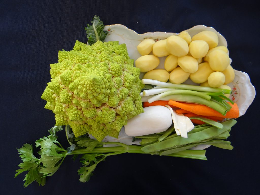 Se pone en el fuego una cacerola con 2 ½ l. de agua fría, 350 g. de zanahorias peladas, 200 g. de judías verdes cortadas las puntas y quitadas las hebras y 300 g. de nabo pelado y cuando comience a hervir se añade 1 k. de patatas quitadas las piel y se deja cocer durante diez minutos a fuego medio, transcurrido el tiempo se añaden 150 g. de cebolletas quitadas la primera capa de piel, 1 kg. de romescu cortado en trozos y lavado bajo el grifo con agua fría (debe de quedar por encima de los demás ingrediéntes y su parte verde no ha de estar cubierta por el agua, para que al tapar la cacerola se haga al vapor), 1 hoja de laurel y 1 porción de quesito, se echa 1 g. de sal fina y se deja cocer durante diez minutos con la cacerola tapada, trascurridos veinte minutos y cuando esté en su punto de cocción se retira el laurel y se trituran todos los ingredientes.