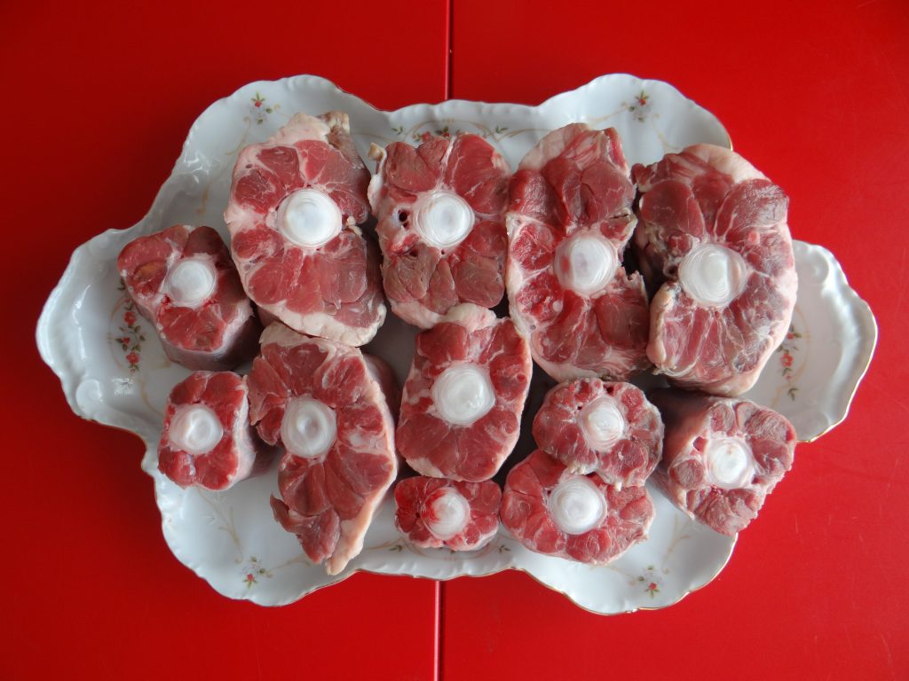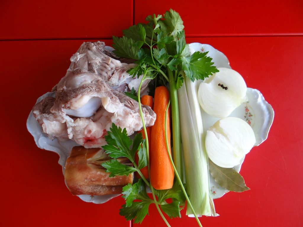 - Se lava bajo el grifo 1 hueso de ternera, 1 carcasa de pollo, 1 hueso de jamón y los trozos de hueso de la parte final del rabo de toro