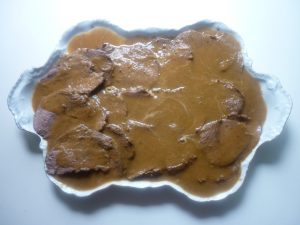 Se pone en una bandeja la carne del redondo cubierta con la salsa y aparte un plato hondo con las patatas fritas.