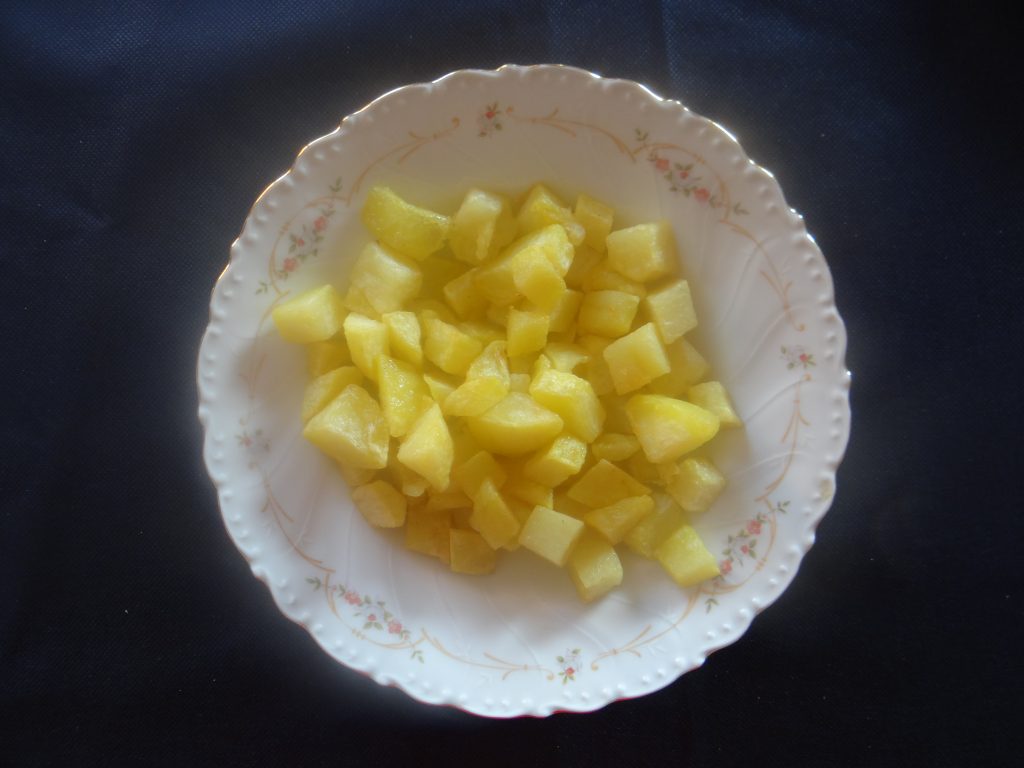 - Se pelan y se cortan en cuadrados de 2 cm. de lado 1 kg. de patatas.