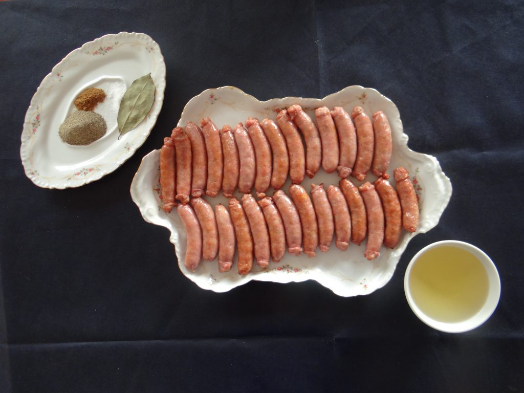 Se pone en el fuego una sartén con ½ dl. de aceite de oliva 0,4 (suave) y cuando comience a calentarse, a fuego medio-fuerte, se añaden las salchichas y se fríen de cuatro en cuatro durante 2 minutos, se les da la vuelta para que se sellen por todos sus lados y se retiran del fuego con la ayuda de una espumadera dejando que escurra el exceso de aceite de las salchichas y se colocan en un plato con papel absorbente.