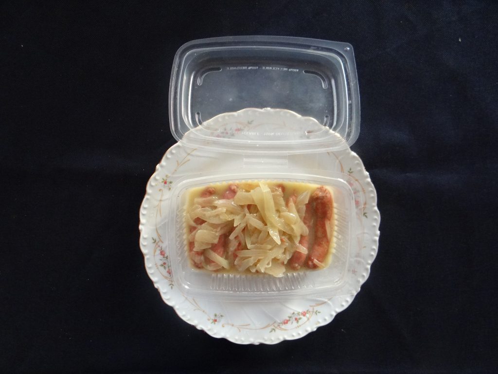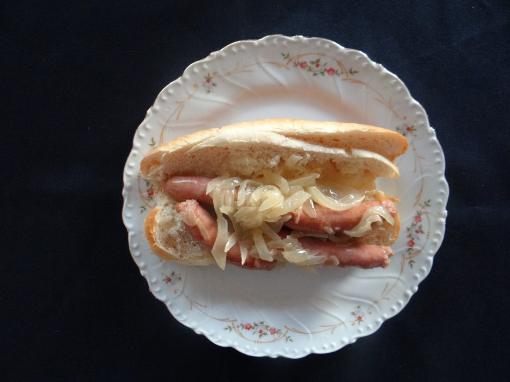 Se presentan las salchichas en una bandeja con la cebolla y la salsa.