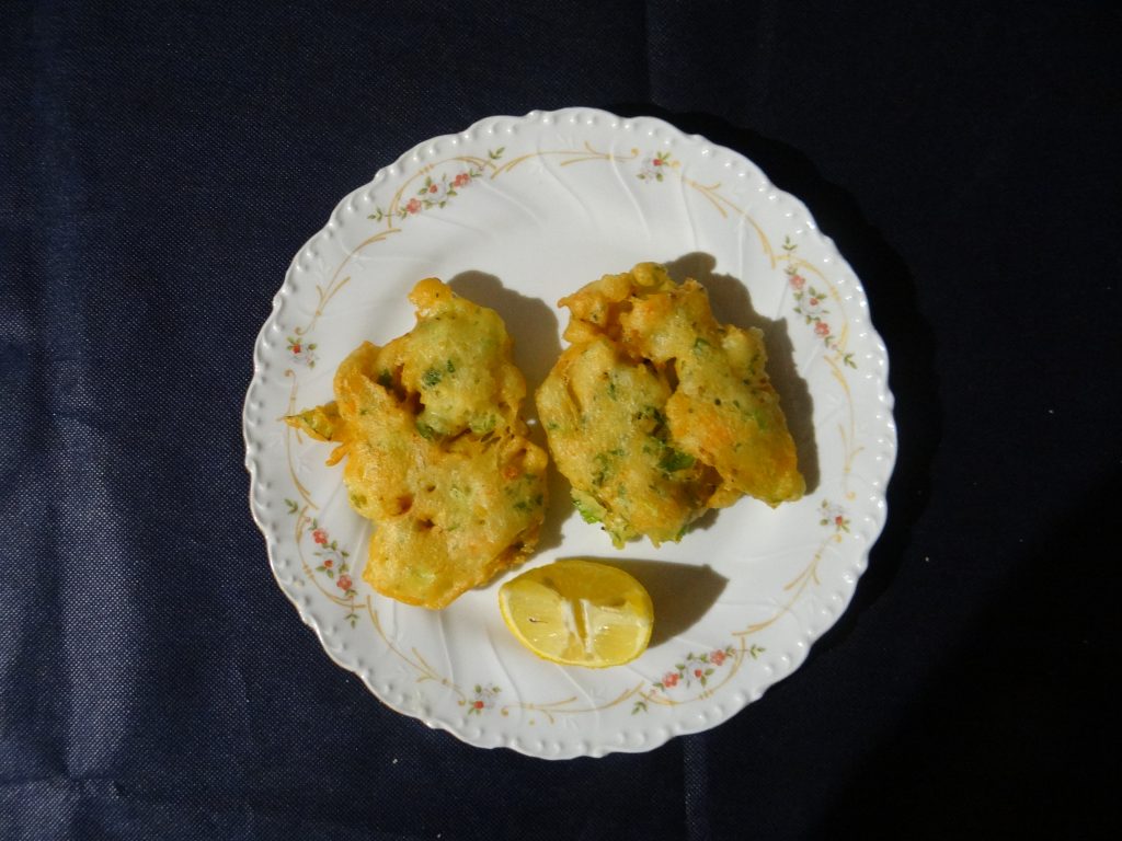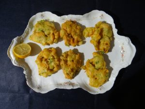 En un bol con 6 cl. de agua templada se disuelven 2 gr. de levadura prensada, se añaden 80 gr. de harina de garbanzos, 80 gr. de harina fuerte y 0,5 gr. de sal fina, se inconporan 4 ml de aceite de oliva 0,4 (suave) y se mezcla con las manos hasta obtener una masa homogénea y un poco densa. Por otra parte se echa 0,5 gr. de sal fina a 300 gr. de camarones cocidos y pelados y se añaden a la masa junto con 120 gr. de cebolleta cortada en trozos pequeños y las hojas de 1 rama de perejil picadas fino y se mezcla, se deja reposar la papilla en un sitio templado durante 3 horas cubierto con film y trancurrido el tiempo con un cuchara sopera se cogen las porciones correspondientes a una torta y se echa en una sarten con 1 dl. de aceite de oliva (suave) muy caliente, se frien de dos en dos porciones.