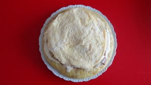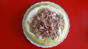 Se pone la tortilla de patatas en un plato llano y se extiende la mahonesa con la ayuda de una cuchara sopera, se extiende por encima 240 gr. de atún y se cubre por encima con una tortilla francesa, en forma de «txapela».